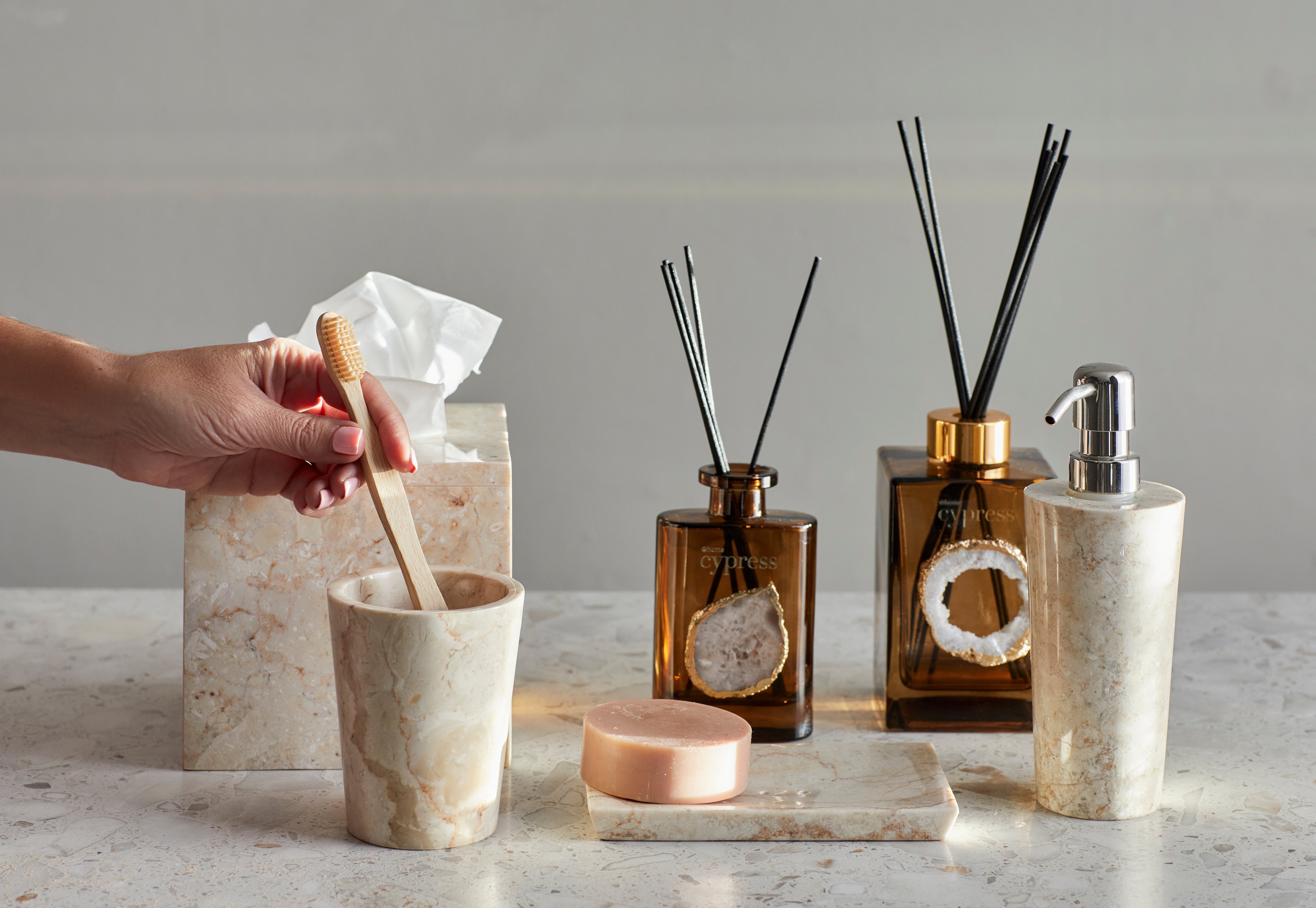 - Choose matching sets for little details: many homeware stores offer matching bathroom sets. If you have 2 bathrooms, purchase 2 mismatched but complementary sets to create some interest for example pairing marble and glass:a marble soap dish or a glass perfume bottle