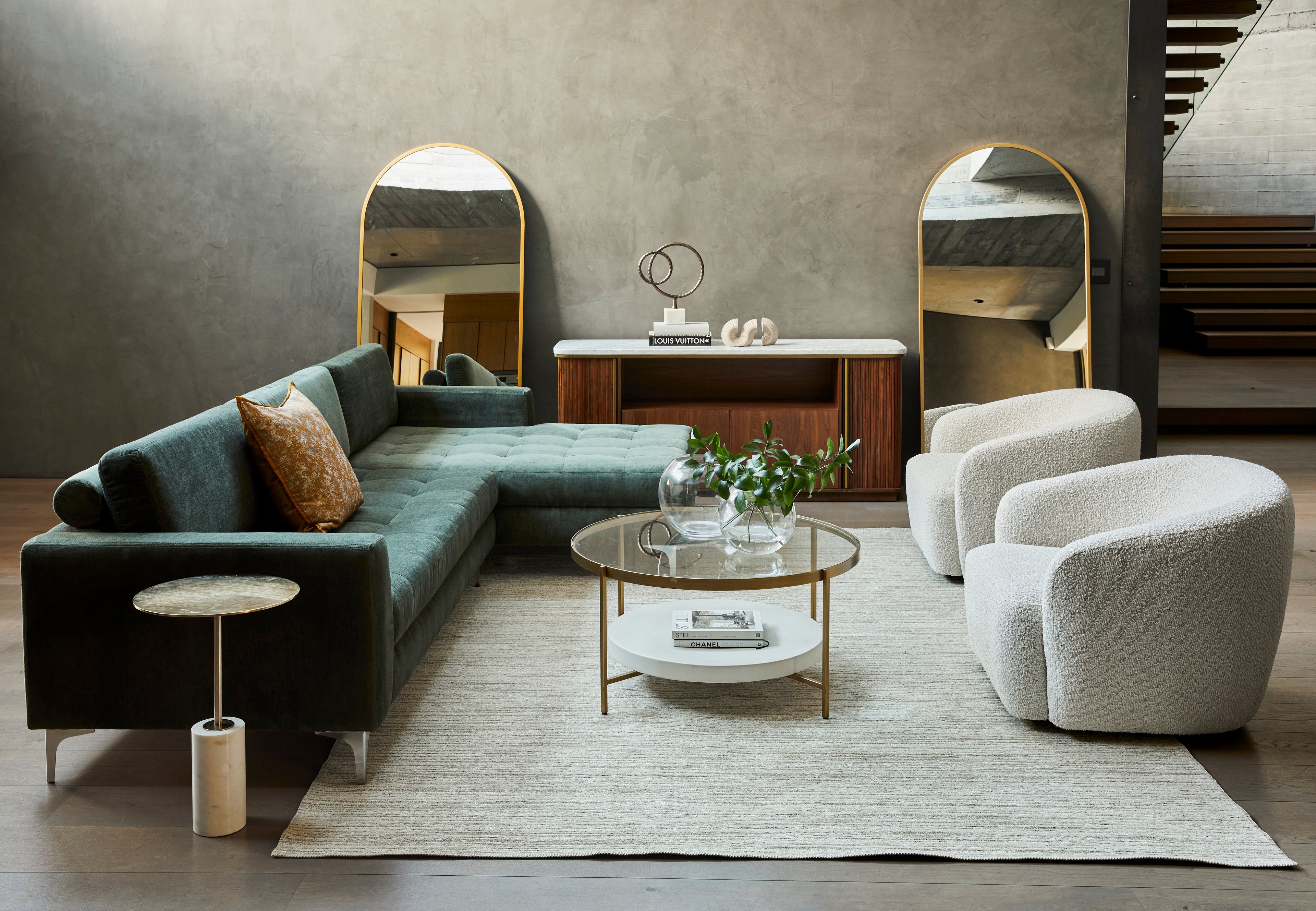 If you’re opting for a smaller carpet in the living room placed under a coffee table, the general guideline is that it should measure at least as long as or slightly longer than the couch. If you’re going big, make sure the carpet is large enough that the couch legs and any chairs in the arrangement can fit fully on the rug with some space on the side and behind the furniture. If your carpet is smaller than this, arrange the furniture so that only the front legs of both the couch and single chairs are on the carpet with the back legs off.