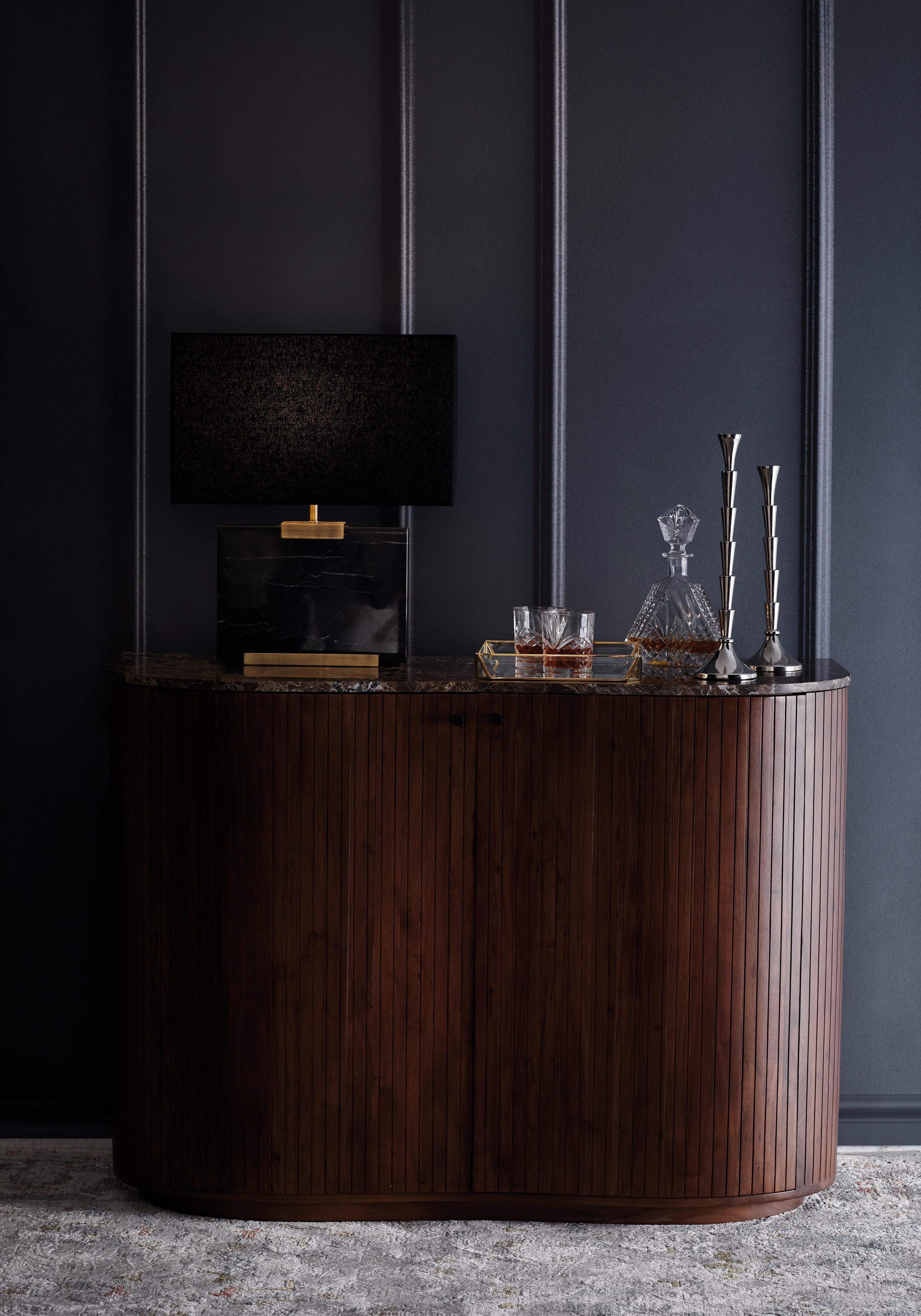 Made from walnut-stained Acacia wood the warm tone is complemented by a richly veined marble top. Interior shelving offers generous storage space, making this cabinet the perfect choice for a bedroom, living room or lounge.