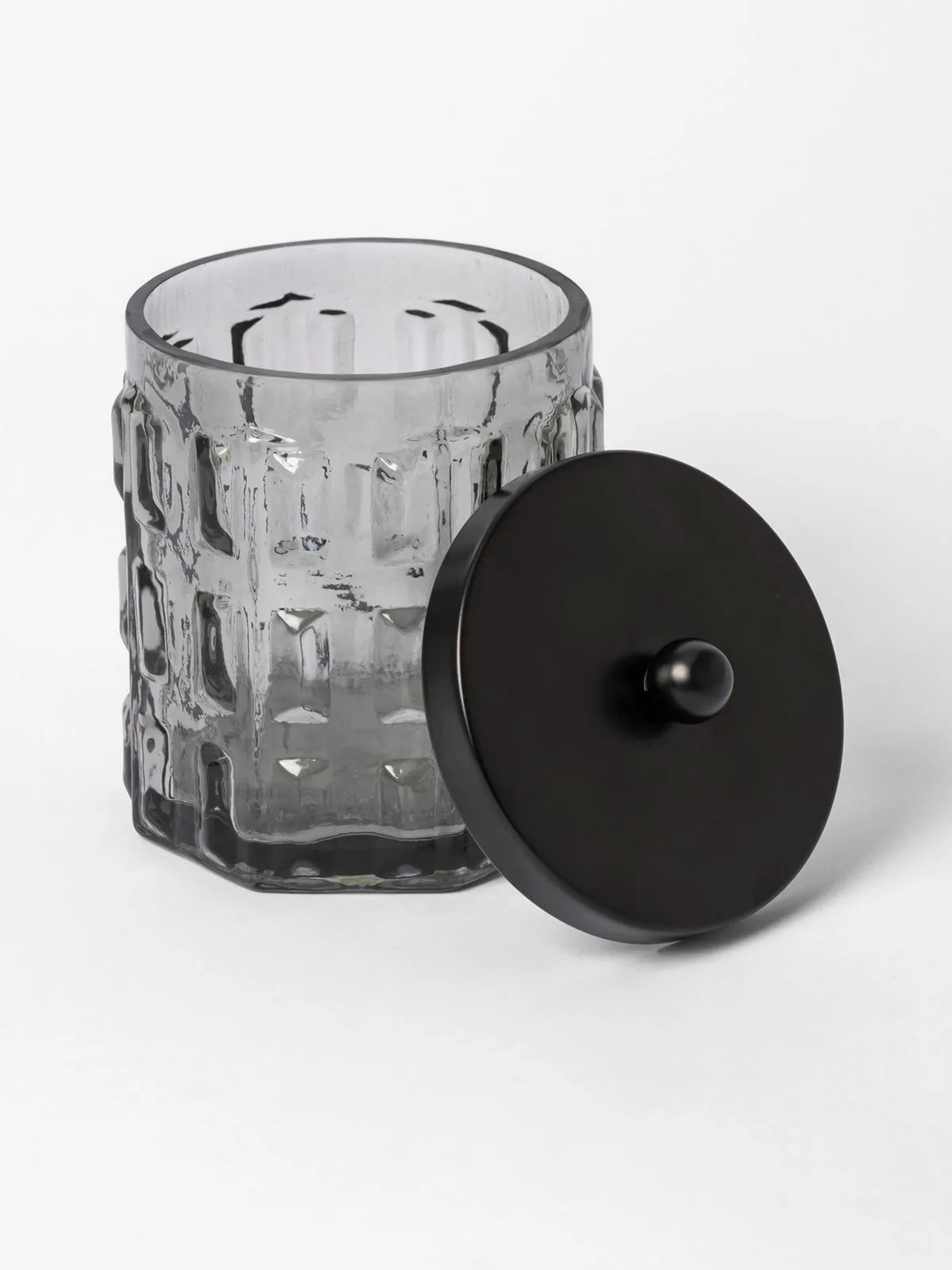 Features a textured block design for a touch of drama. A black plated metal lid completes the look. Use this stylish vessel for storing cotton balls or buds. Complement the look with other bathroom accessories in the same style.