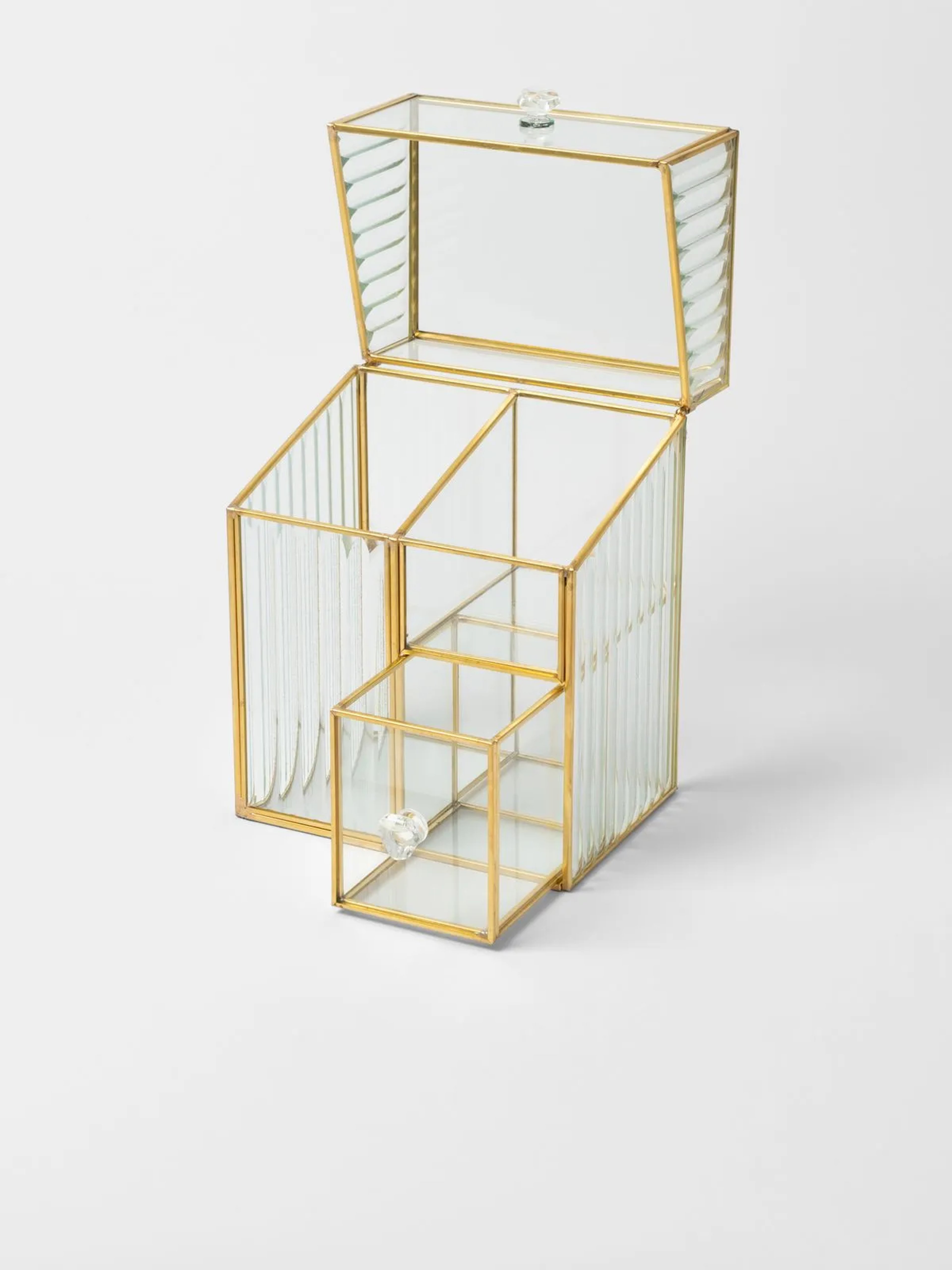 Stylish and practical, our Fluted Glass & Metal Storage Box With 2 Drawers is the perfect balance of functional storage and elegant design. Use it to hold perfumes, makeup, or skincare products on a vanity countertop for a neat and tidy display solution.