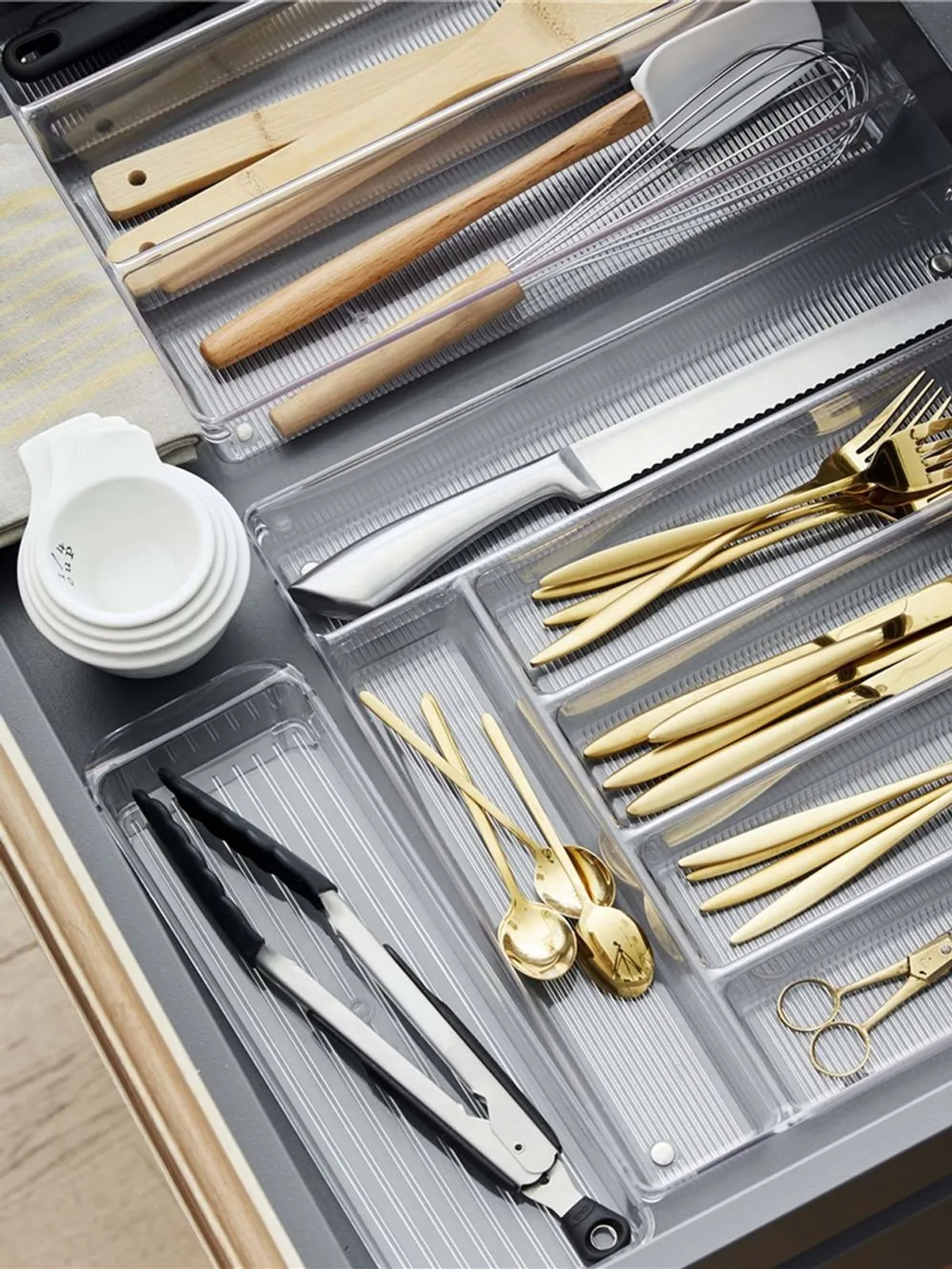 This modular design comprises ten individual trays of different sizes that are able to be clipped together on all sides, allowing you to arrange them in any order to fit your drawer space.