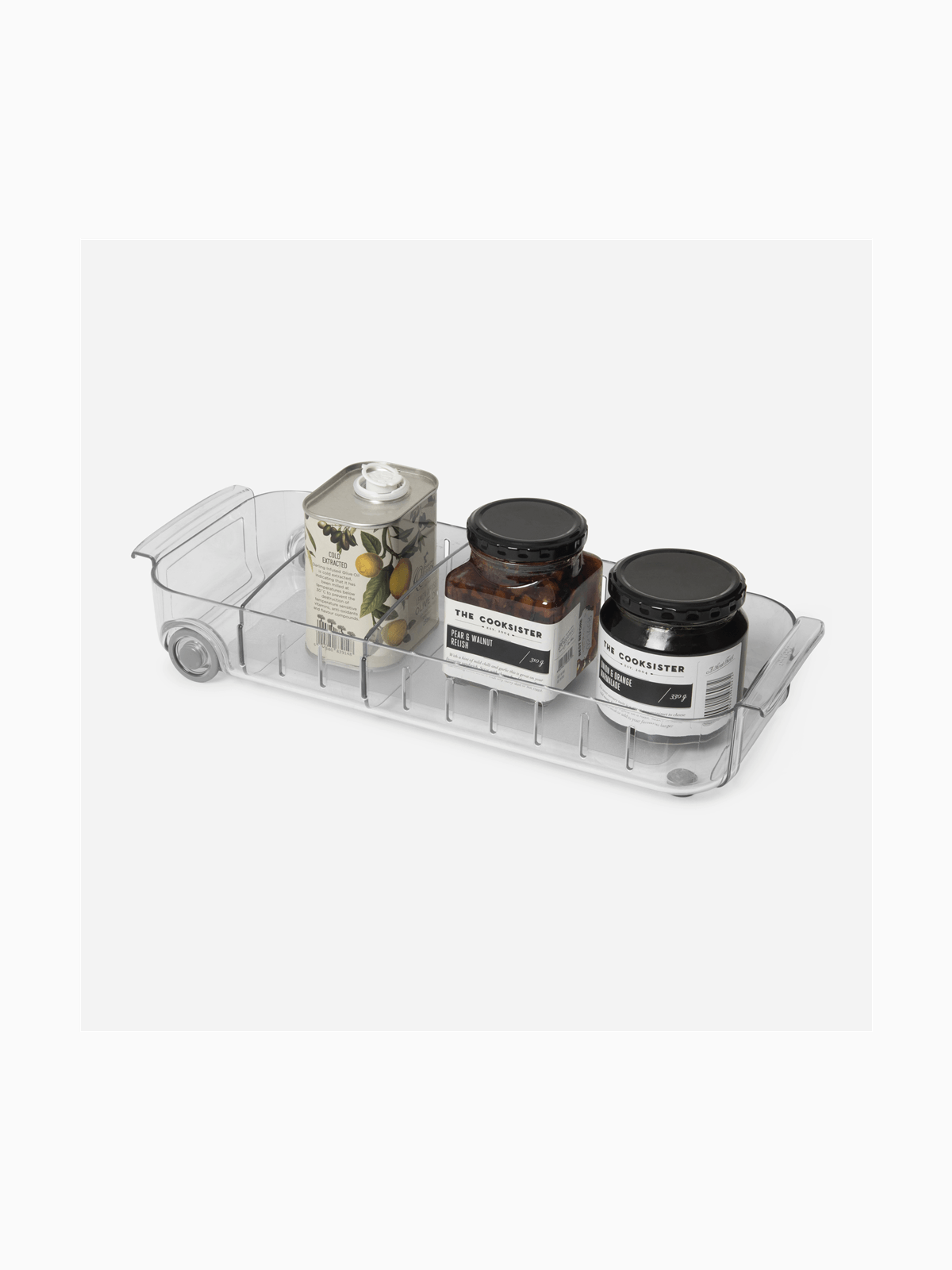 Designed to create order and maximise space in your fridge with wheels to roll items from the back for an easy find. Dividers can be adjusted to keep items seperate, while smooth wheels and sturdy handles help you pull food forward without disturbing the rest.