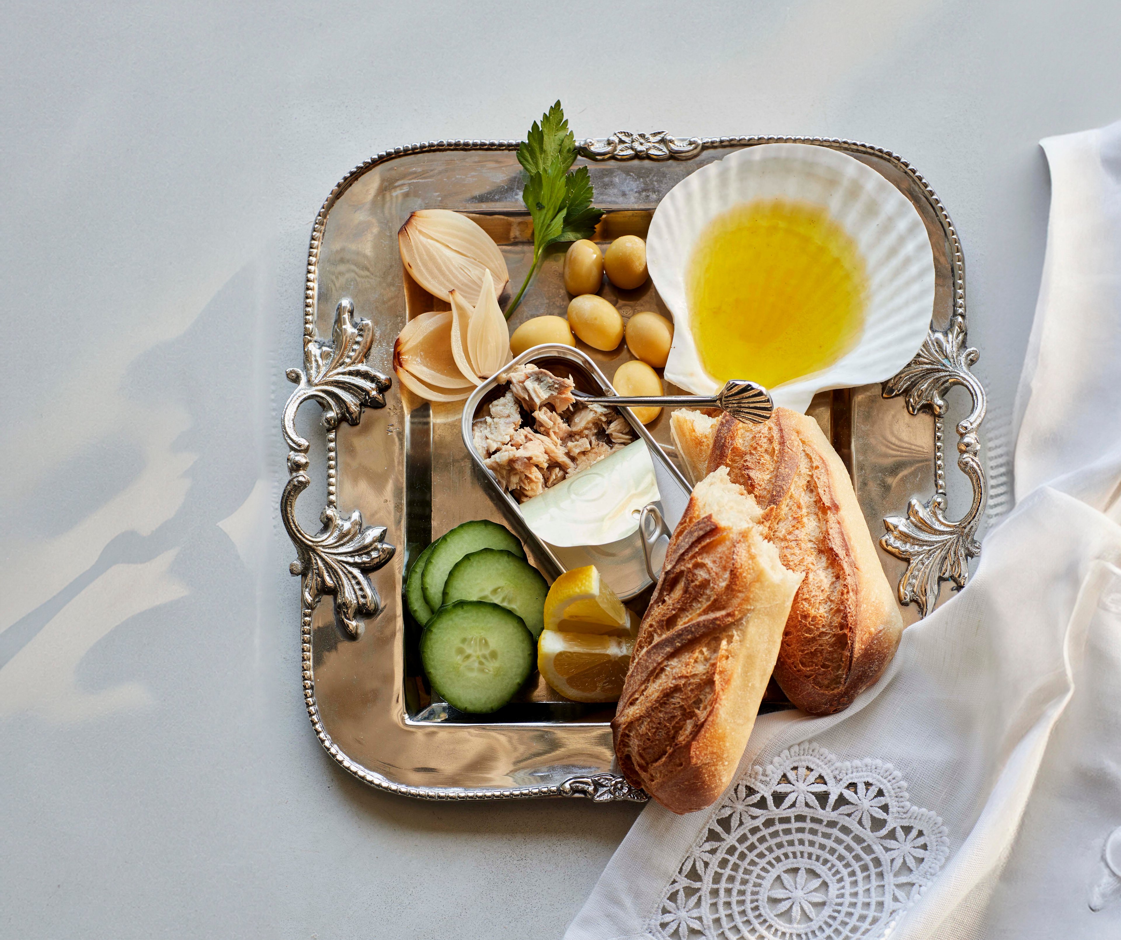 Slice the baguette, or bread - breaking some pieces for texture and styling.