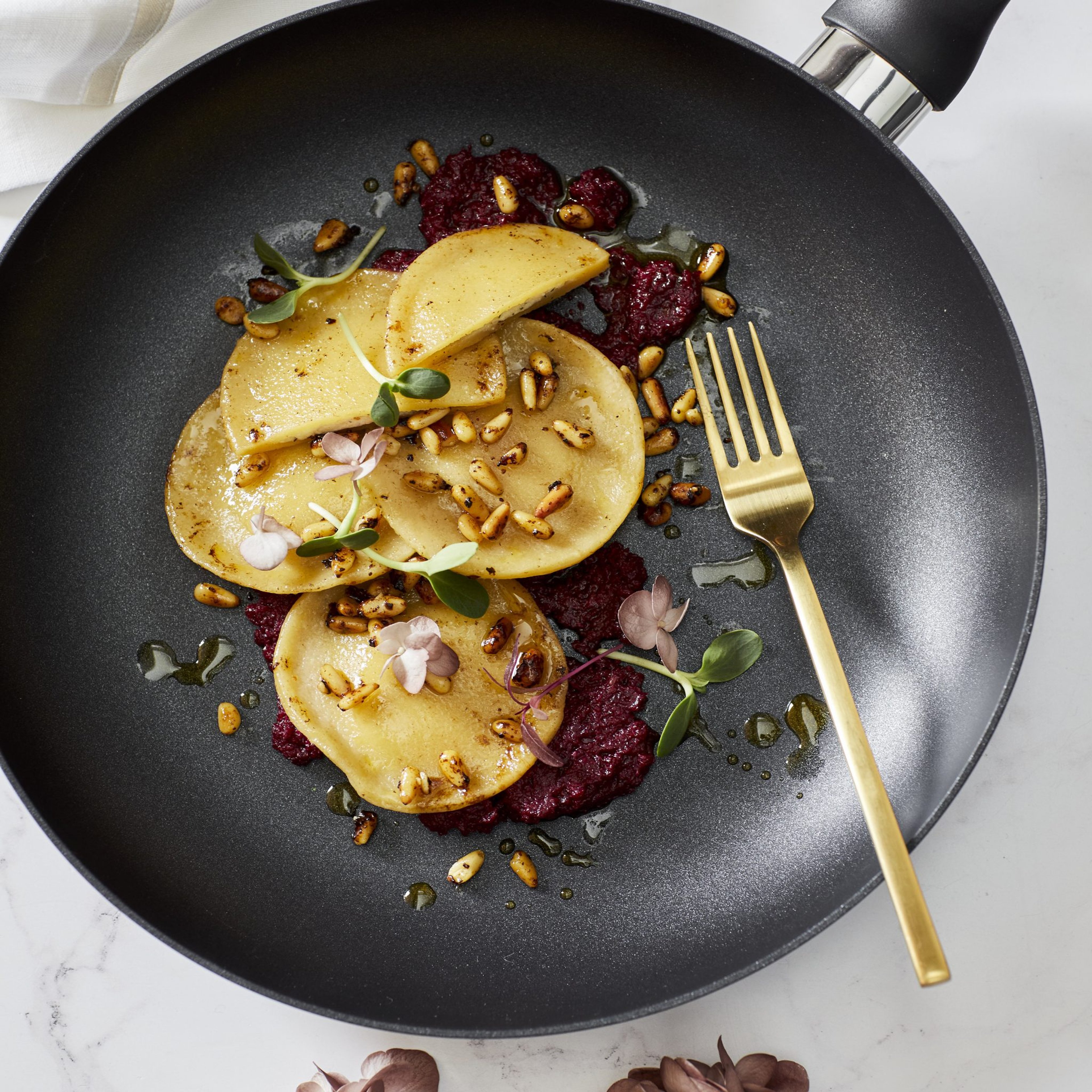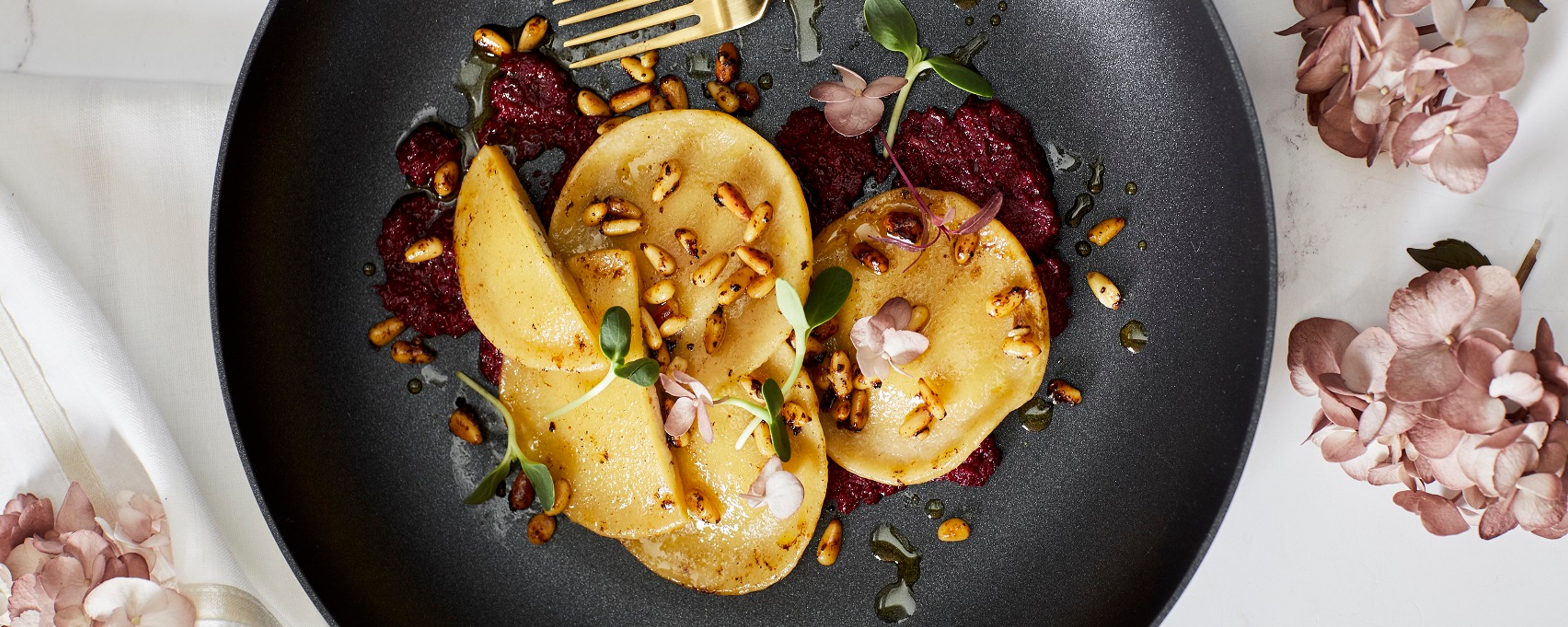 Goats Cheese Ravioli with Beetroot Pesto & Warm Pine Nut Butter