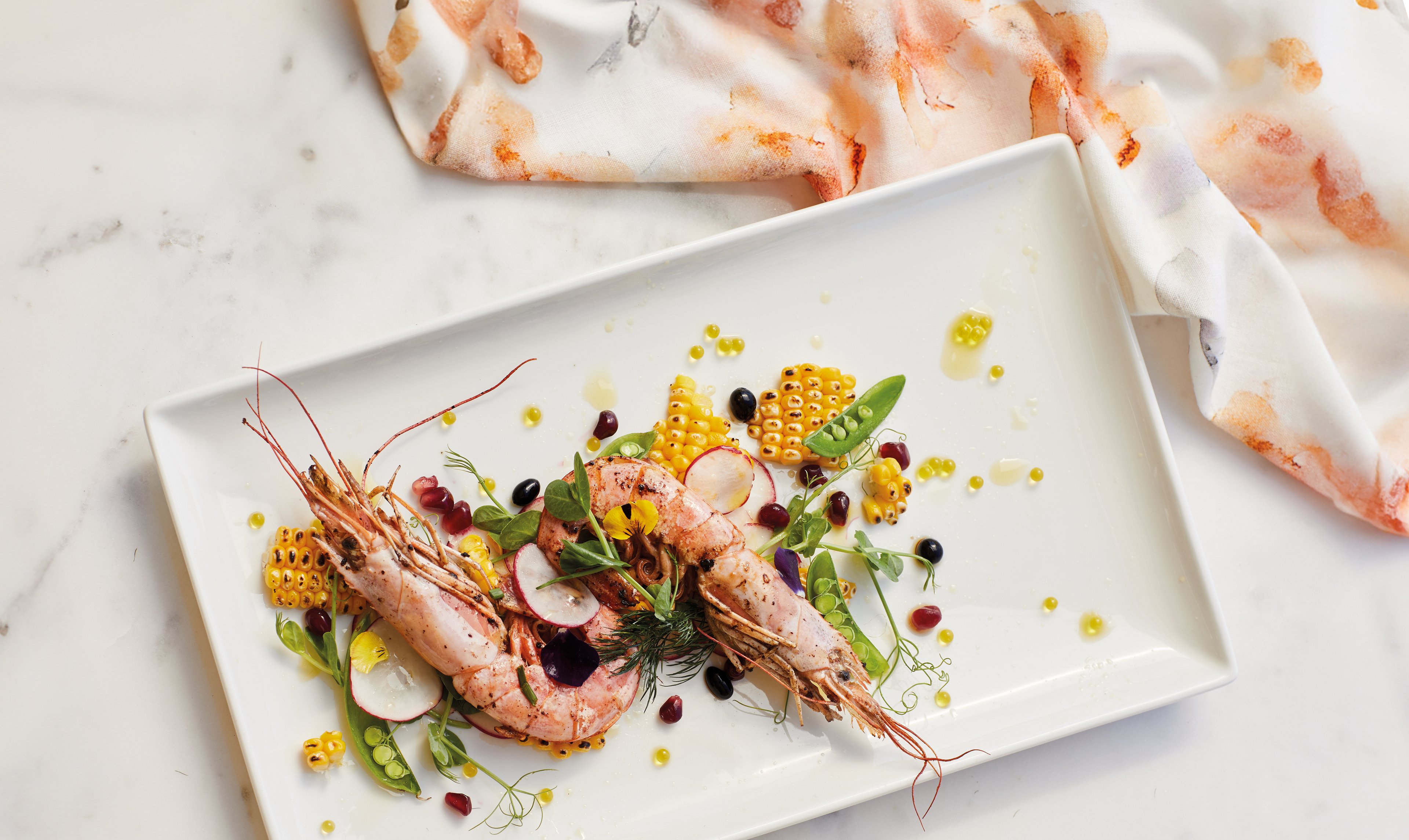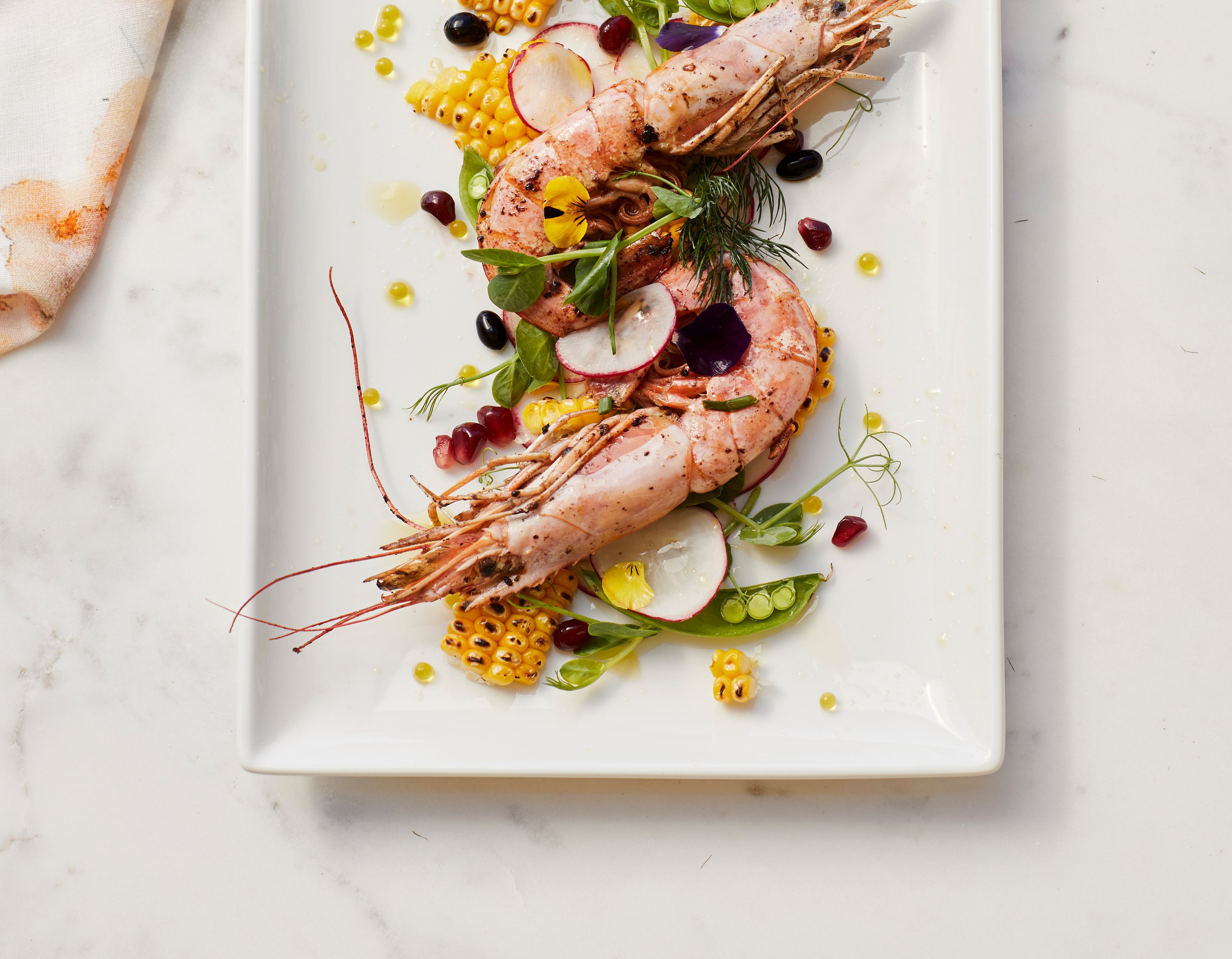 Spoon some corn coulis in middle of plate. Place salad on coulis; top evenly with prawns. Garnish with pomegranate pips and olive oil pearls.