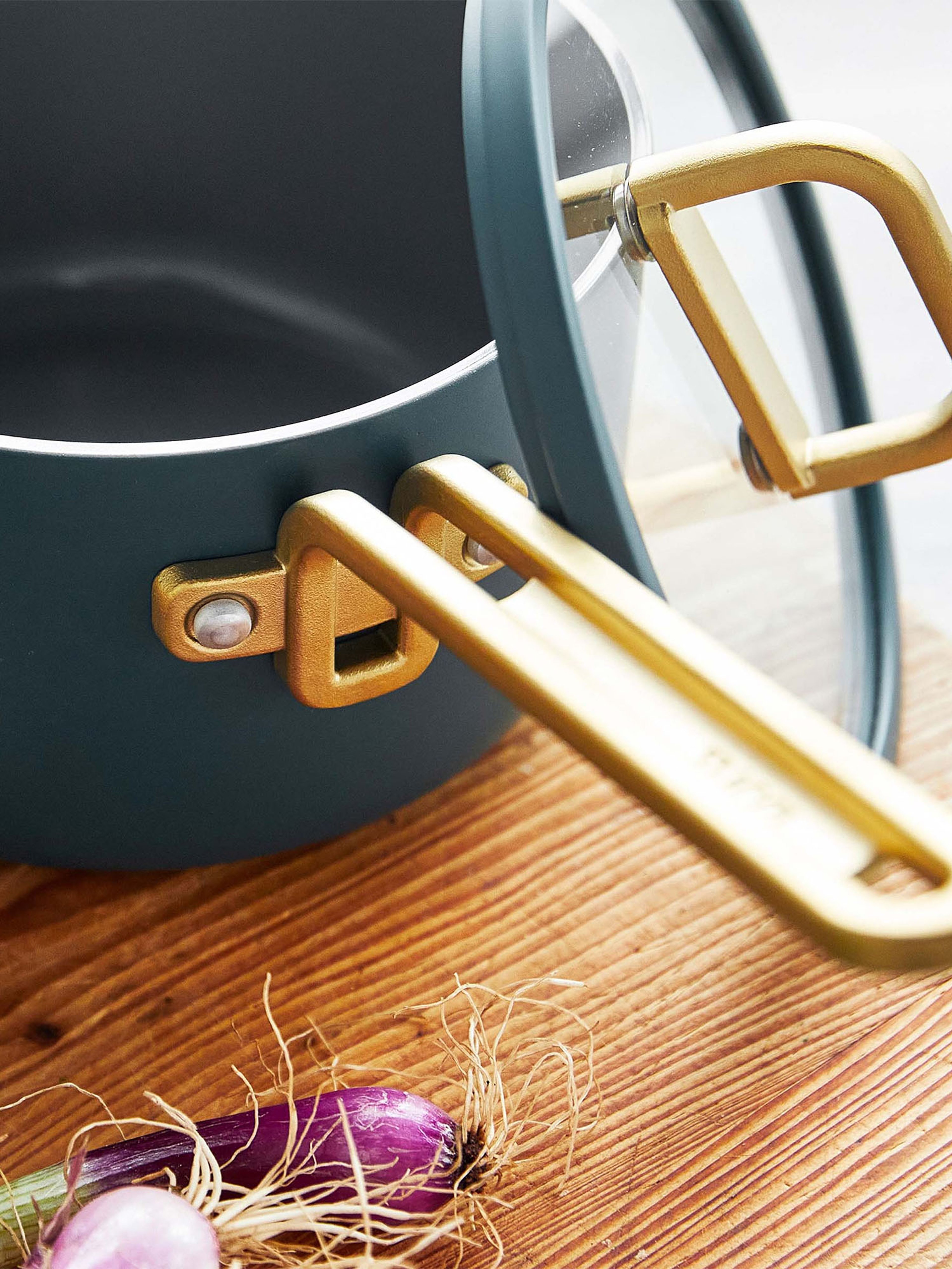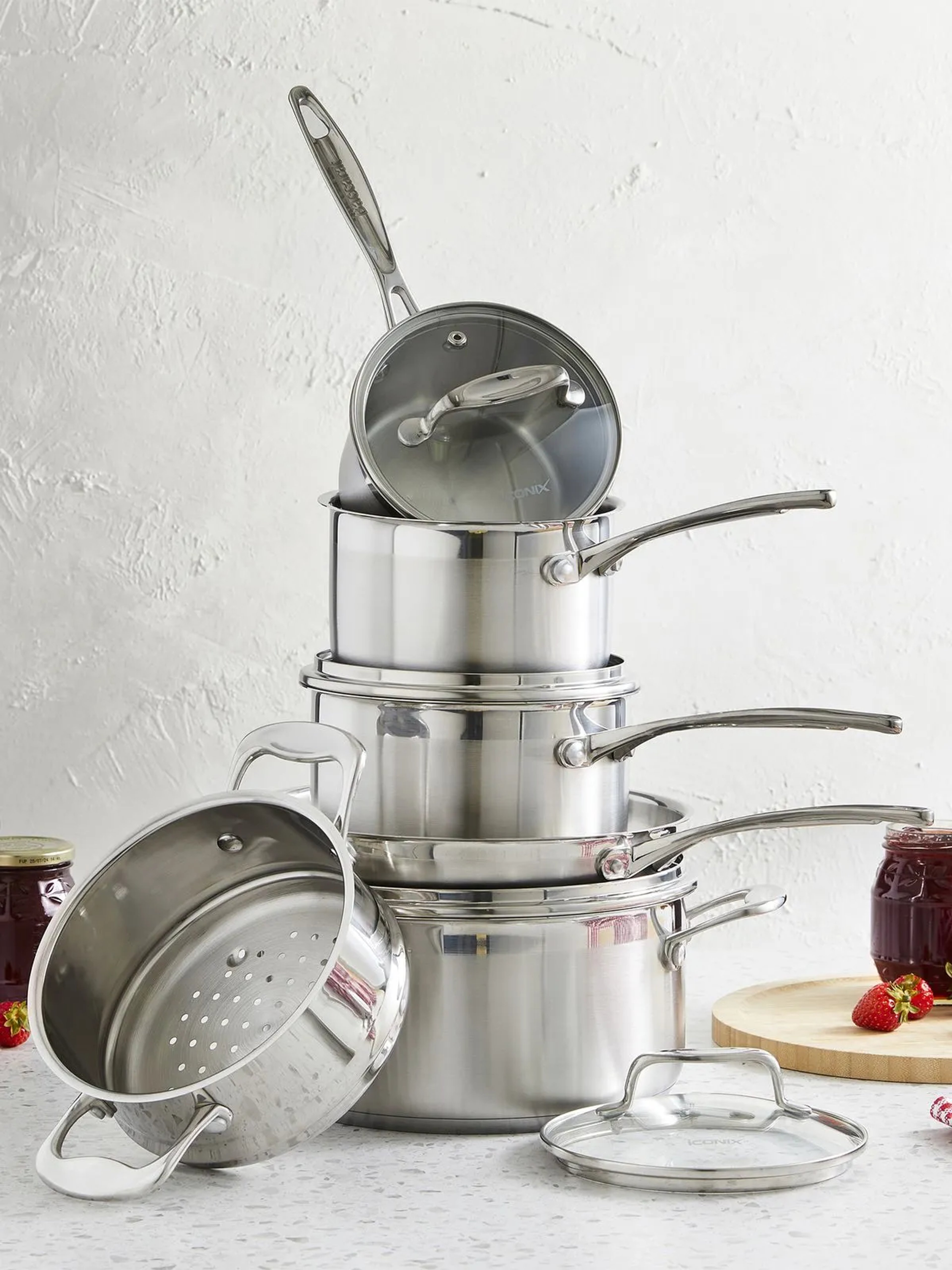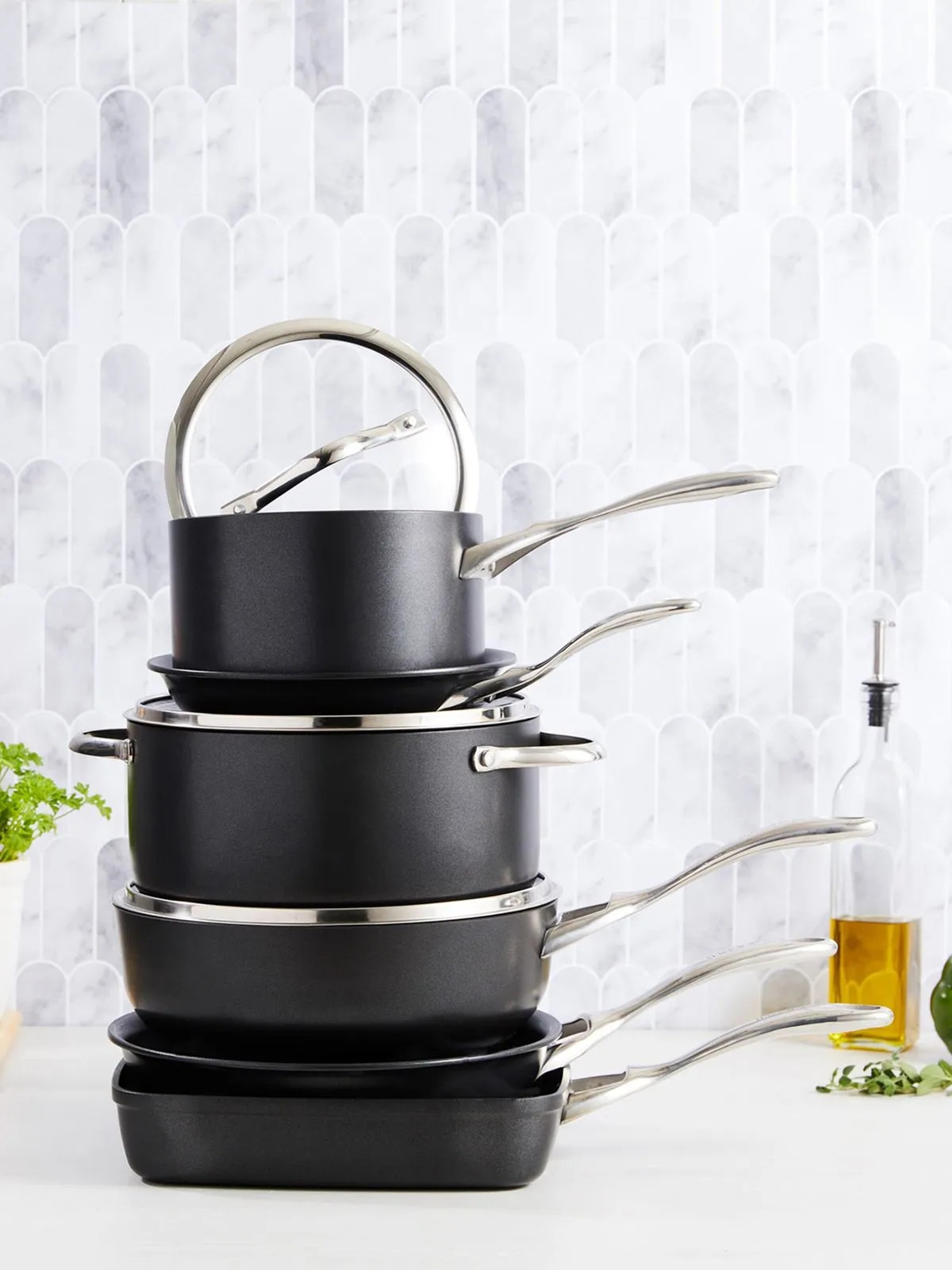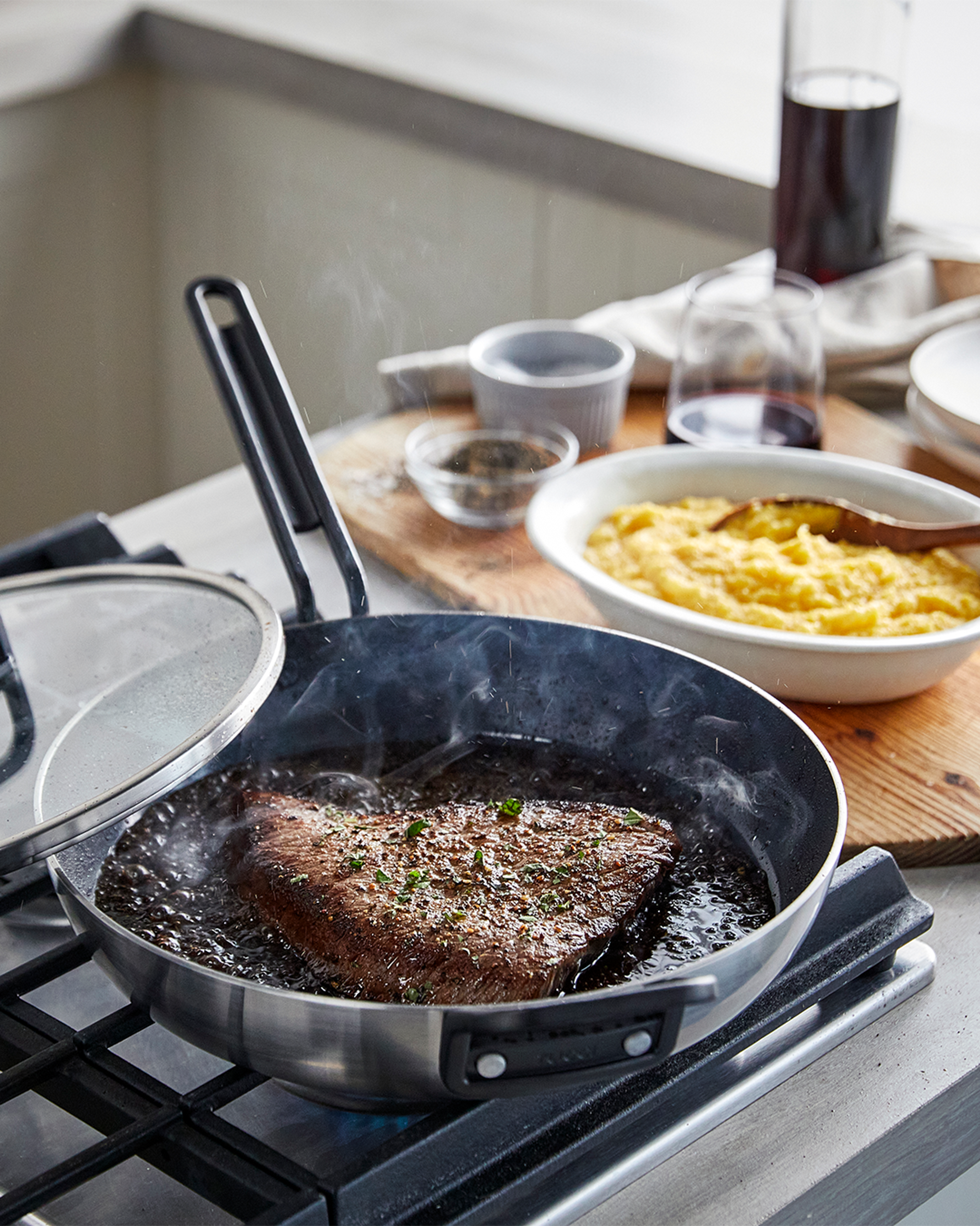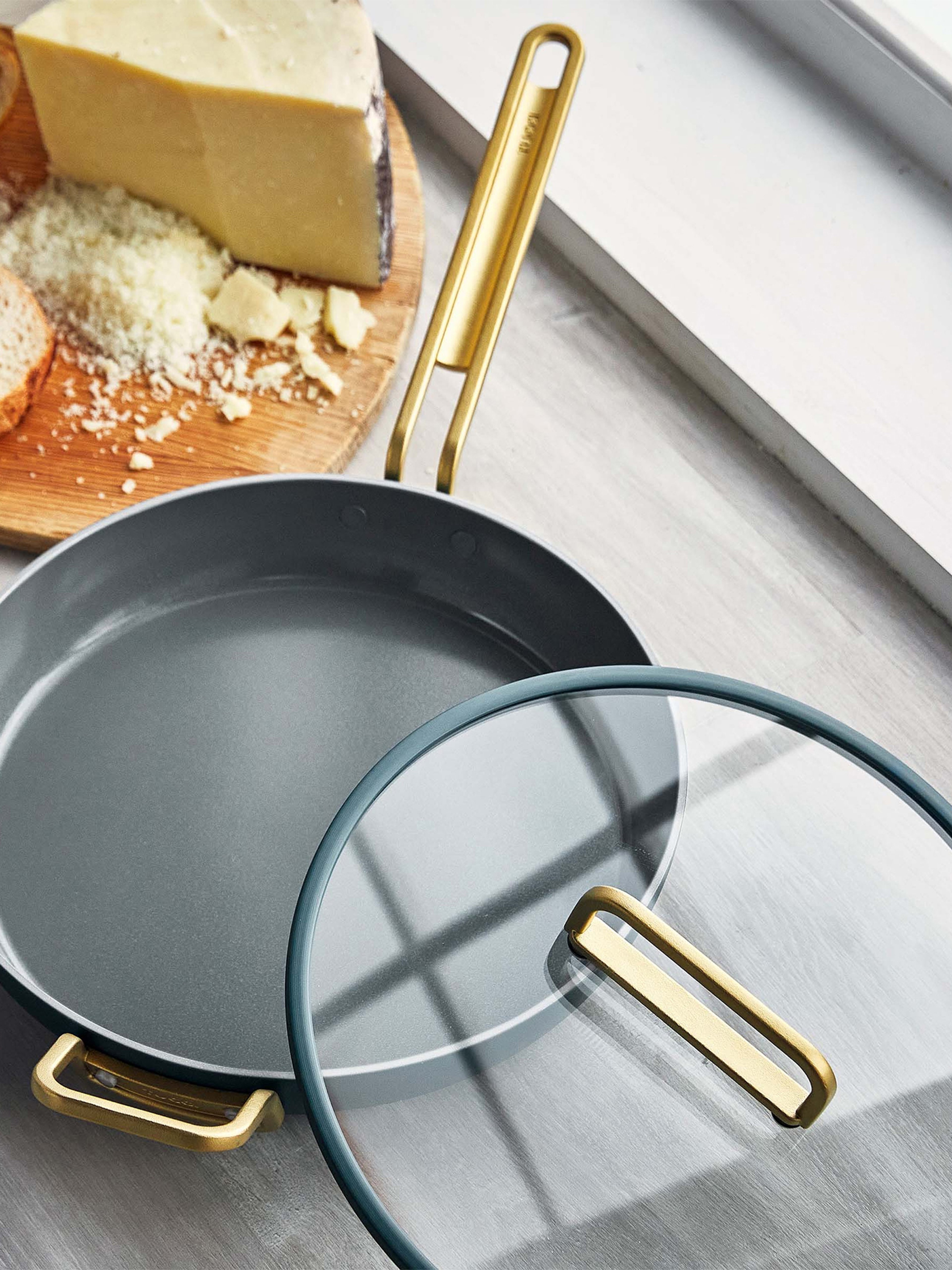 Tight-fitting tempered glass lids are reinforced with stainless-steel rims that match each pan’s body for a seamless look.
