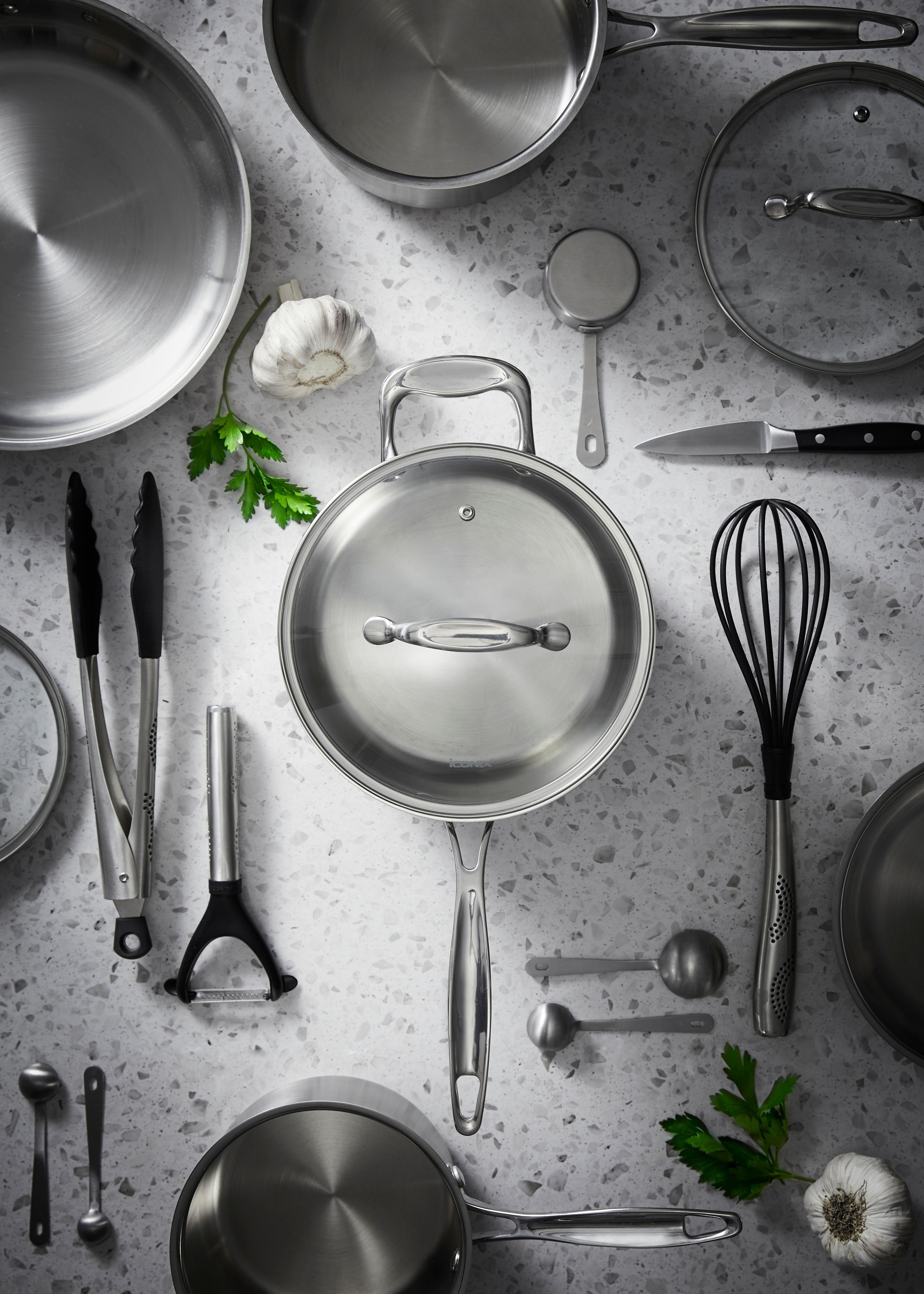 Cast stainless-steel handles are specially designed for each piece to provide optimal comfort and control.