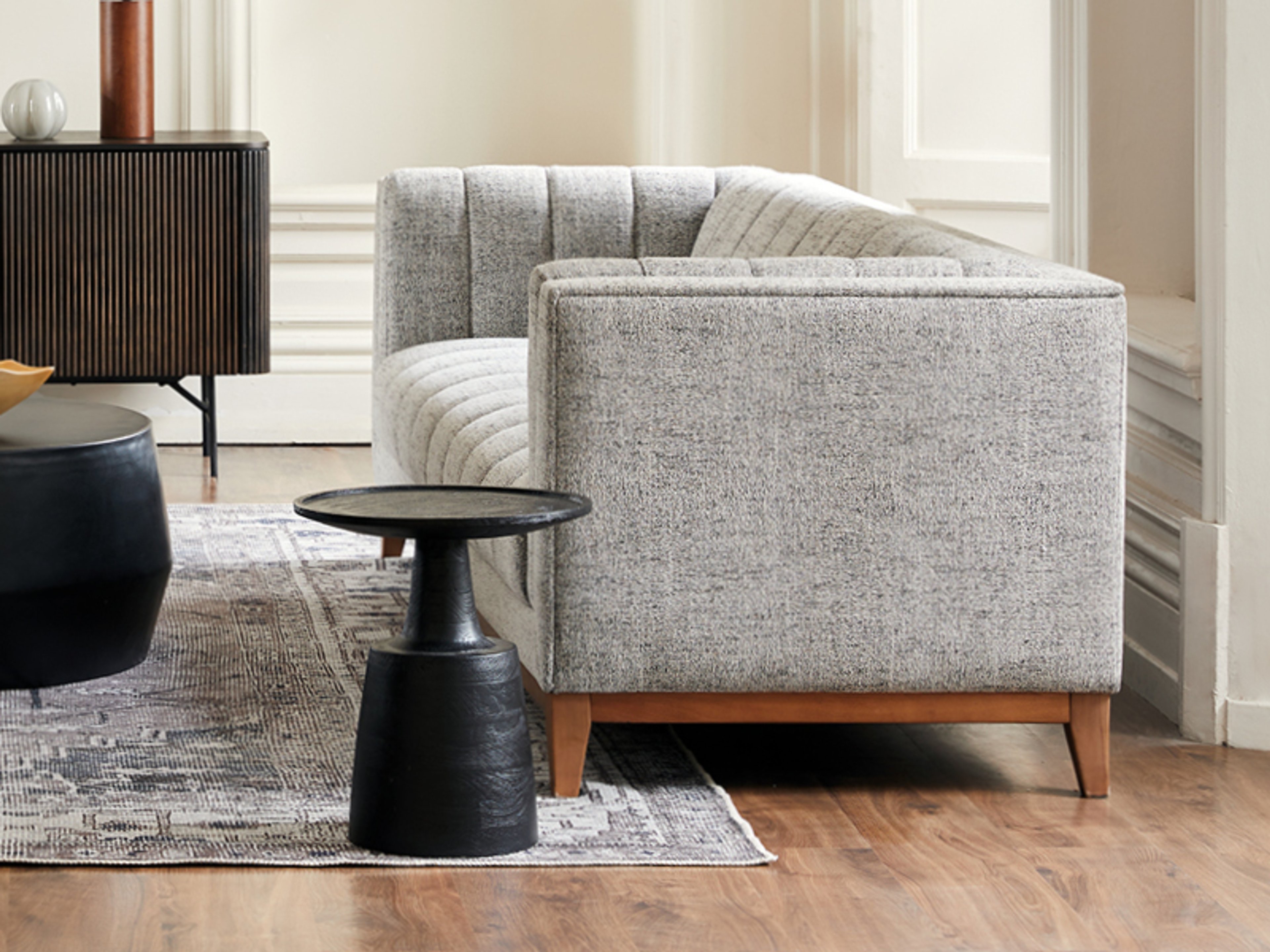 The Pale couch offers a stunning mix of form and function. Fully upholstered in a range of richly textured fabrics, its soft, curved silhouette exudes both elegance and comfort. With its sculptural design, the Pale couch makes an effortlessly modern statement in your living room.