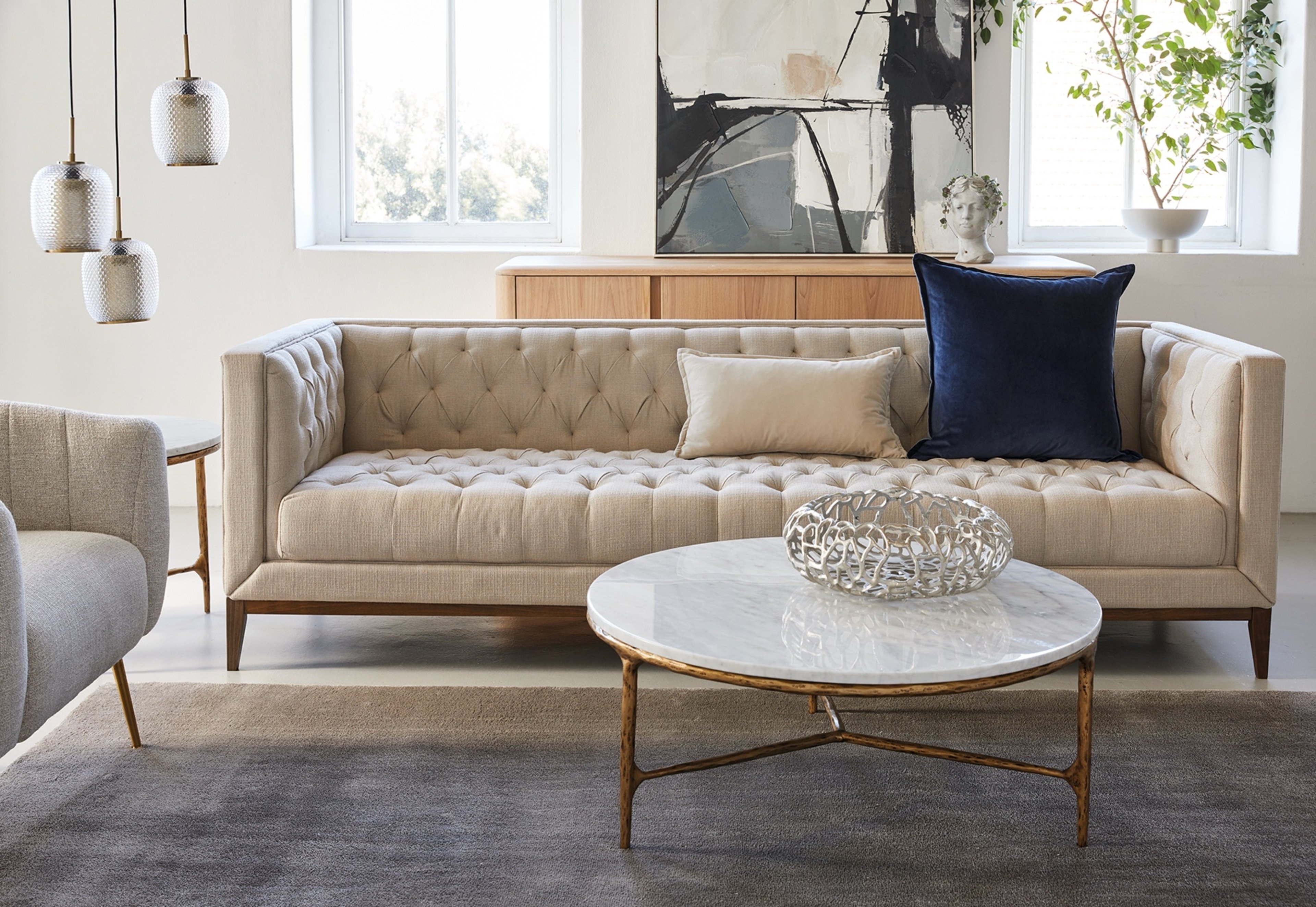 The Carin couch is a modern take on a classic sofa silhouette featuring a soft and inviting tufted design complemented by clean lines and considered details. Fully upholstered with elegant slim brass legs, this couch offers both comfort and style to bring a contemporary look with timeless appeal to your home.